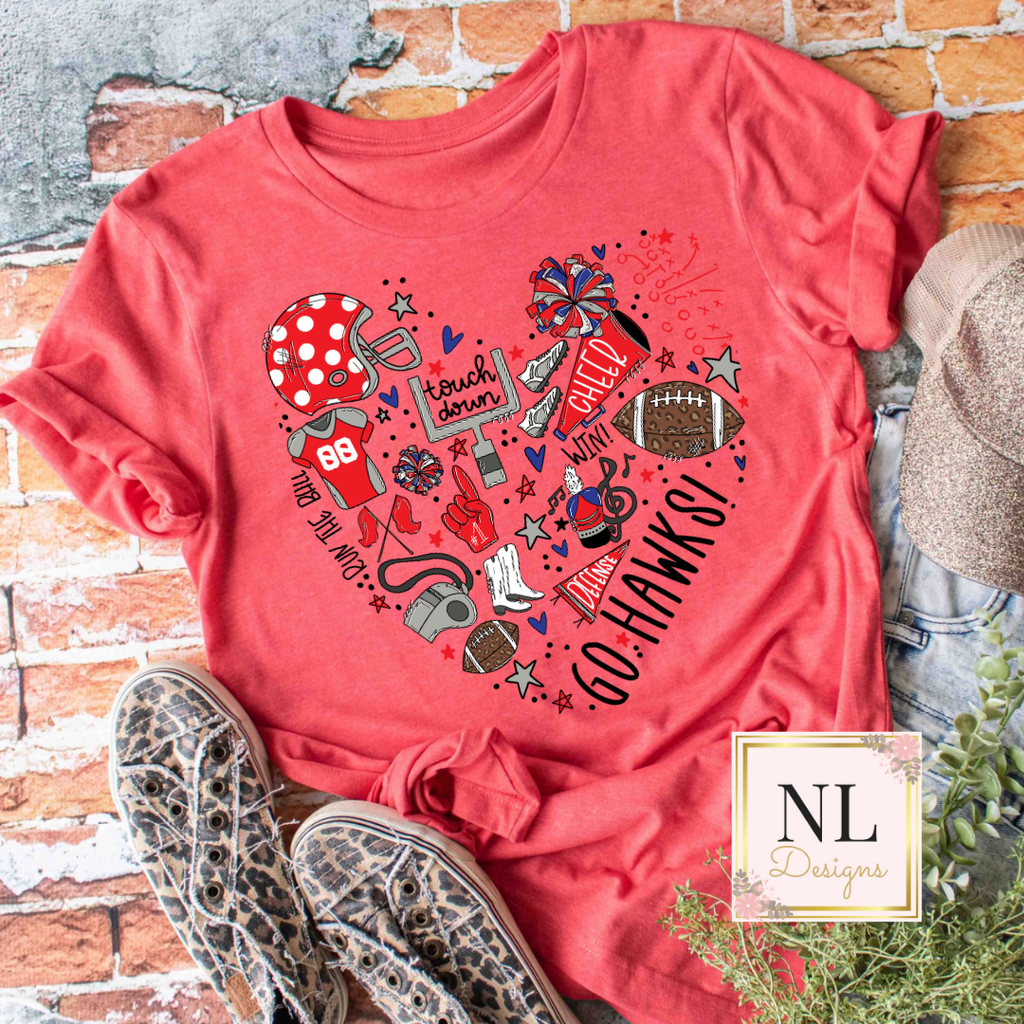 Show your team pride with this lively Hawks-themed tee featuring spirited football and cheer graphics arranged in a heart shape. The bright playful design makes it a standout choice for game days or casual wear. Soft and stylish, it’s perfect for fans ready to cheer their team on in comfort.