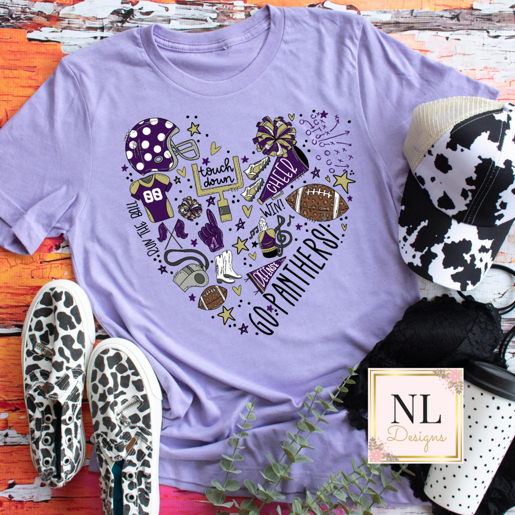 Celebrate your team spirit with this vibrant Panthers-themed tee featuring playful football and cheer graphics arranged in a heart shape. Its soft lilac tone and eye-catching design make it perfect for game day or casual wear to show off your enthusiasm. Comfortable and fun, it’s a must-have for every devoted fan.
