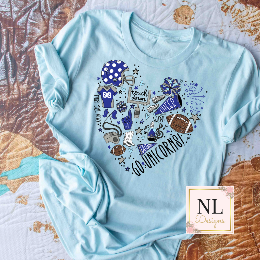 Celebrate your team spirit with this charming Unicorns-themed tee featuring fun football and cheer elements arranged in a heart shape. The soft ice blue shade combined with the playful design makes it perfect for fans to wear on game days or anytime. Comfortable and stylish, it’s a great way to showcase your enthusiasm.